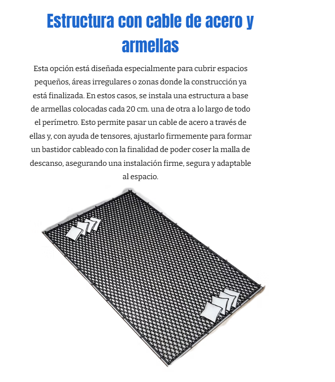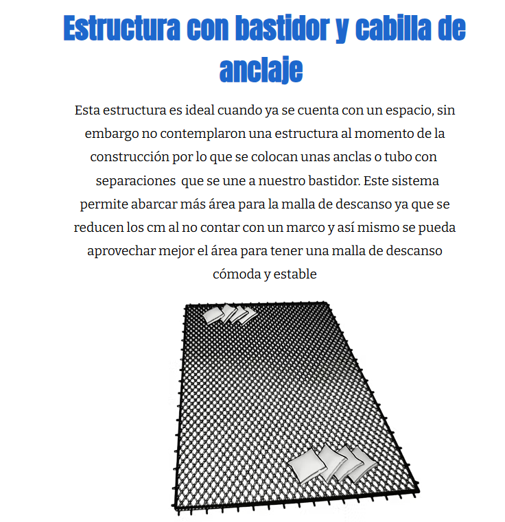 Gracias a nuestra experiencia hemos implementado diferentes modelos adaptándose a las necesidades de cada cliente, los modelos diseñados son pensados para ofrecer seguridad ya que las estructuras son parte importante y debe ir de la mano con respecto a la malla de descanso y su instalación.